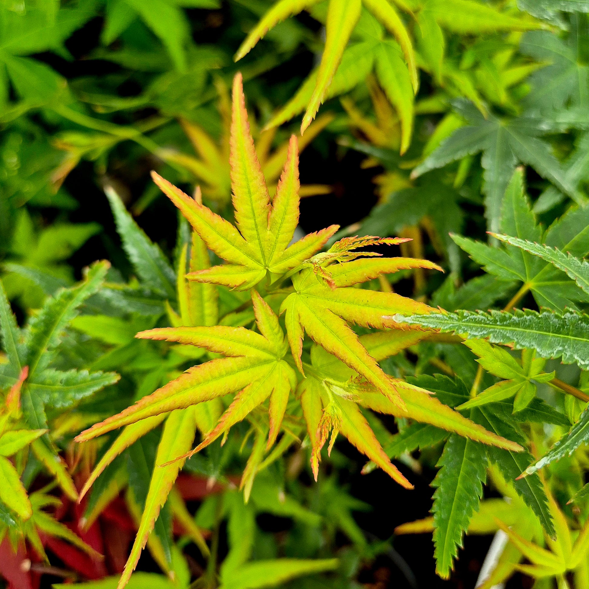 A beautifully compact Japanese maple with tiny leaves that emerge light green with red edges, fade to medium green in summer, and finish in vivid orange-yellow. Grows to just 1 m after 10 years.